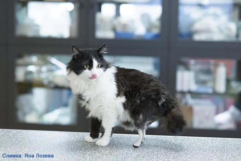 A Beautiful Longhaired Tuxedo Cat Shows Off His New Prosthetic Back Paws After A Severe Injury